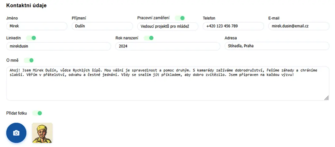 Zelené přepínače u jednotlivých polí slouží k zapnutí nebo vypnutí konkrétní položky v životopise.